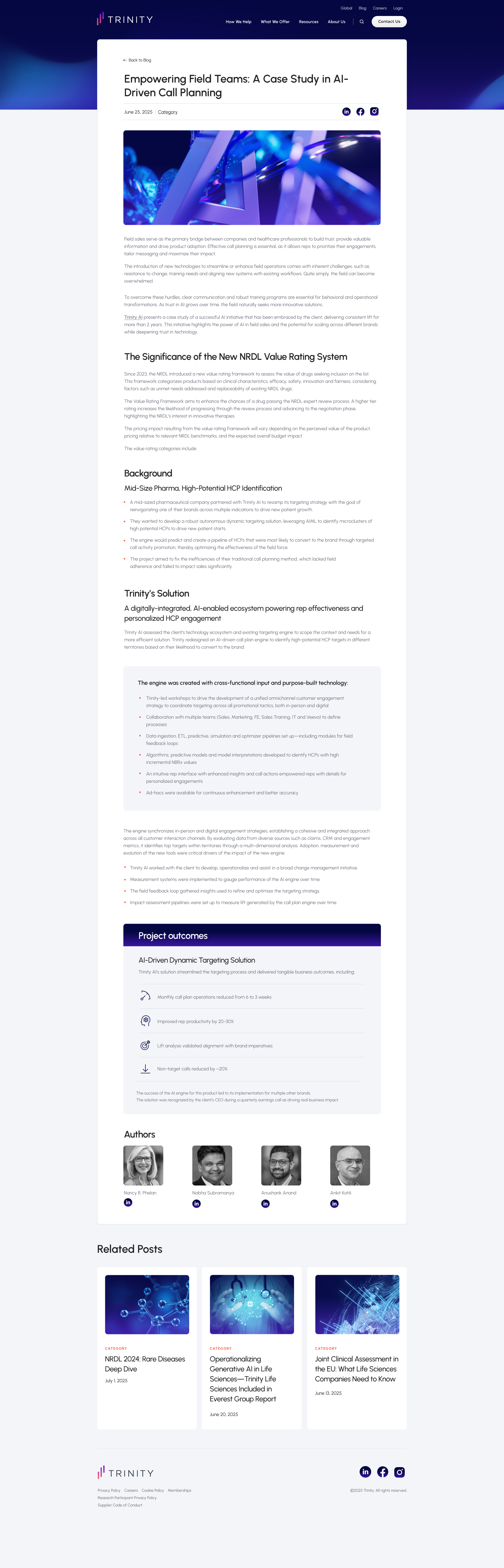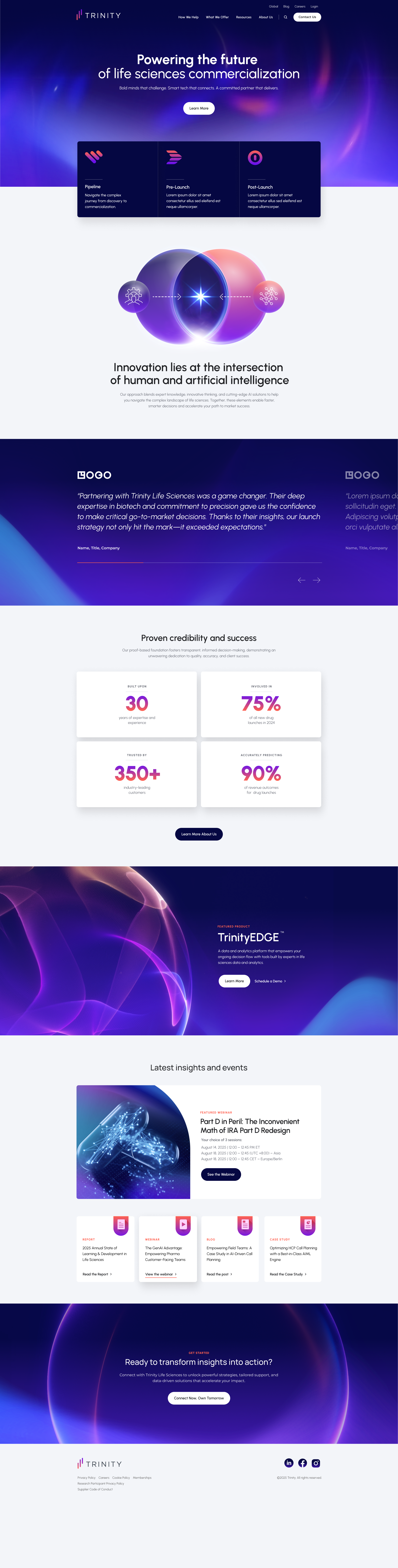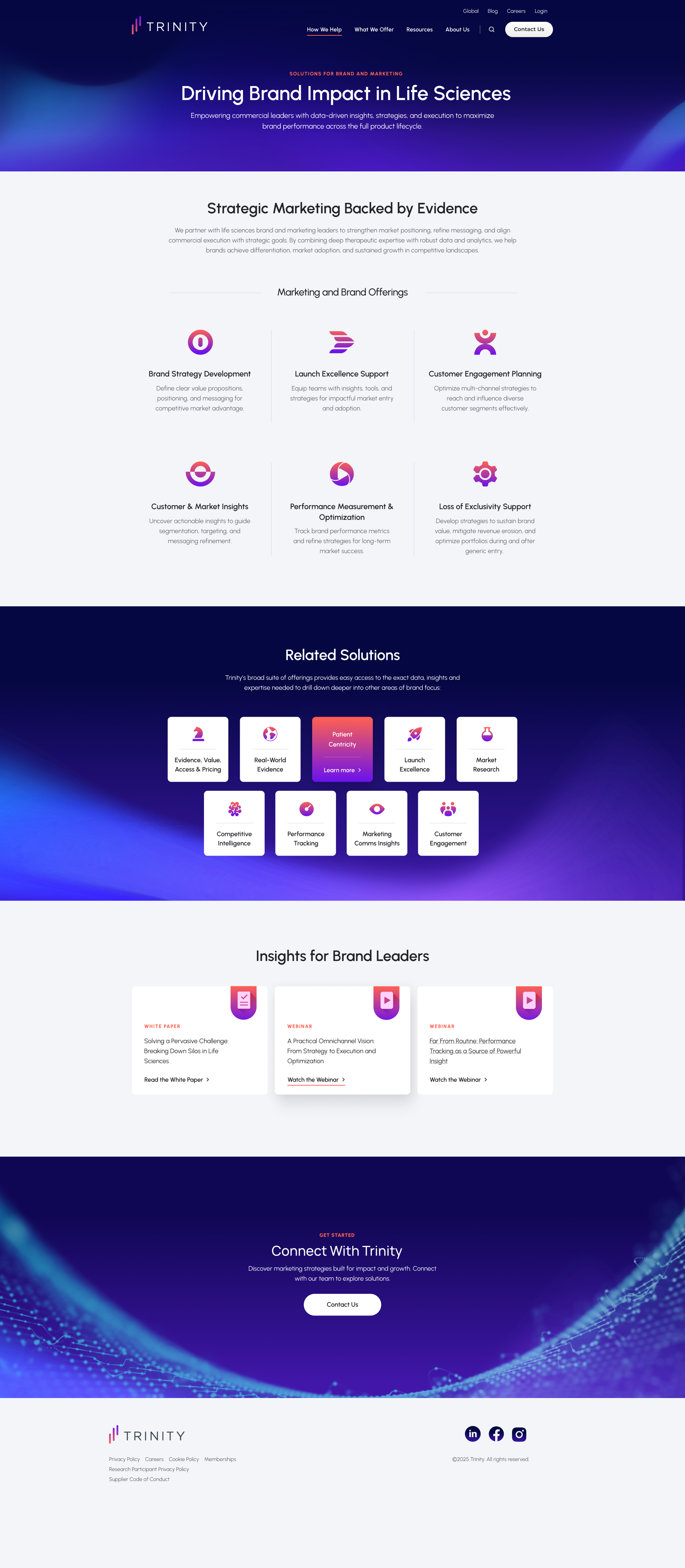 Trinity Life Sciences partners with leading life sciences companies to turn data and insights into smarter clinical and commercial decisions. The goal of the website redesign was to drive more qualified leads, boost SEO performance, and modernize the brand to reflect Trinity’s innovative spirit. The previous site was complex and message-heavy, making it difficult for visitors to quickly understand Trinity’s value. We simplified the site structure, refined messaging around customer challenges and outcomes, and introduced a clean, contemporary design system. The result is a clear, engaging digital experience that captures attention, communicates expertise, and converts visitors into meaningful opportunities.